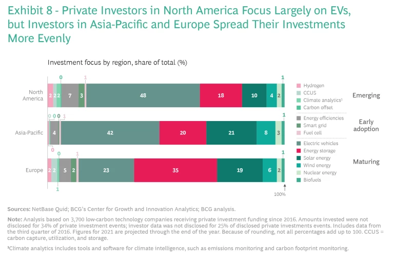 The Technology Mix. Investors in all three regions continue to focus their efforts on mature technologies, but this may change over the next several years. Almost half of North American private investment, for example, is going into EVs; considerably less is going into solar energy and energy storage as a share of the total. (See Exhibit 8). In Asia-Pacific, almost a third of investment is still going into solar and wind energy. In Europe, by contrast, a third of investment is going into energy storage, making it the top technology being invested in; EVs are second, followed by solar and then wind.
