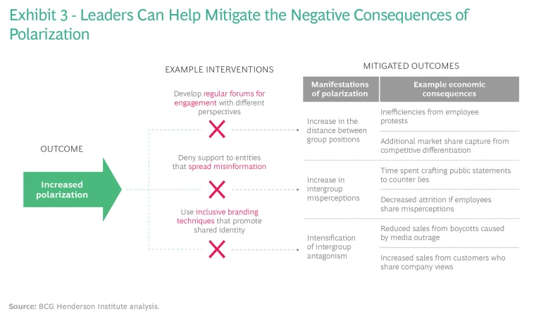 Polarization is not going to go away anytime soon. By helping to structurally reduce and mitigate the negative consequences of polarization, CEOs reduce the level of harm that polarization can inflict within their broader societies and within their companies. (See Exhibit 3.) As members of different groups engage more sincerely, they may discover that they have more in common, encouraging attraction and reducing repulsion. Increasing cross-group interactions will decrease the spread of divisive narratives and, consequently, intergroup antagonism. A decrease in antagonism will enable individuals to embrace diverse, overlapping group identities without fear of social backlash, preventing further clustering and radicalization of group identities.