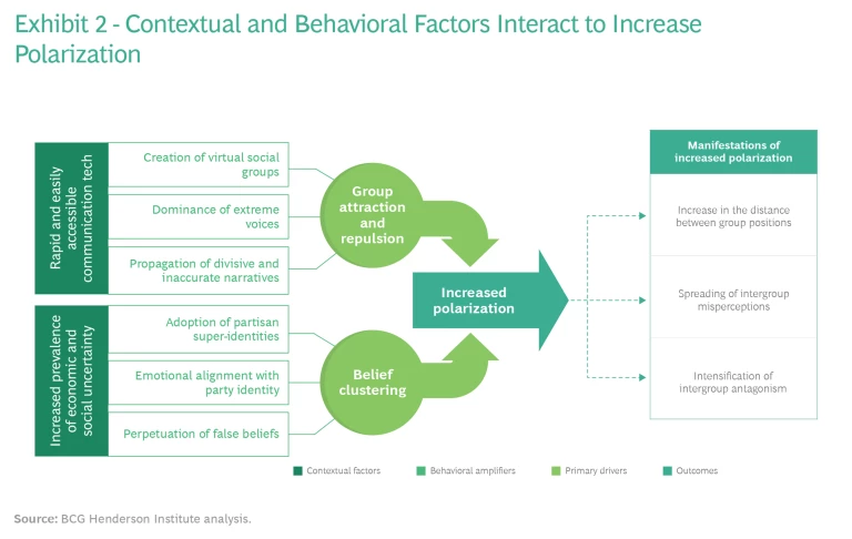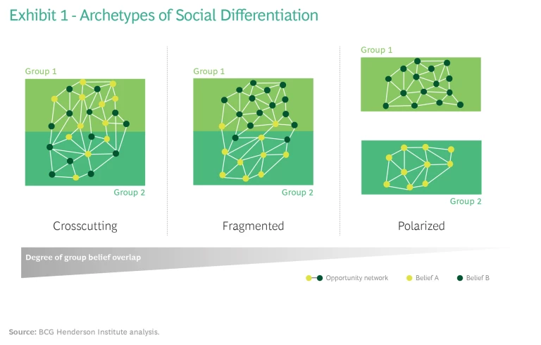 Polarization is at the extreme end of a spectrum of social differentiation. (See Exhibit 1.) Increased differentiation is not uniformly negative—clearly defined identities can create strong bonds within a group (sometimes called “bonding”). However, when it progresses to extreme levels, heterogeneity of beliefs within groups and interactions between groups (“bridging”) are reduced or eliminated, with damaging effects.