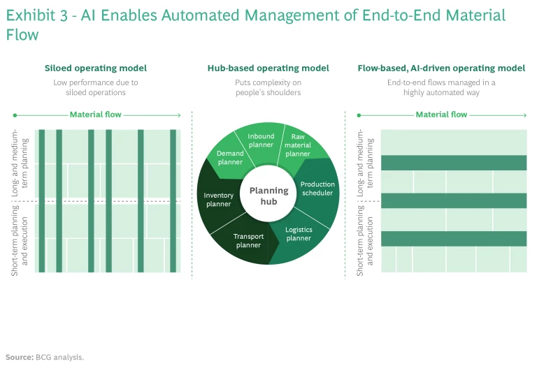 Design entirely new human–machine operating models. Today, people execute most of the work while using analytics platforms to provide often complex situational insights. In the worst cases, they do so in organizational silos that operate too independently along the end-to-end material flow. In the best cases, the company uses a cross-functional, hub-like operating model in which planning teams try to find good solutions in a complex environment with some help from analytics. In the new operating model, a carefully designed AI platform finds the solutions. (See Exhibit 3.) The vision of seamlessly connecting information across the various “flows” of activity in the end-to-end supply chain becomes more realistic. The AI engine supports planners in gathering information from all sources and escalates only critical decisions to the manager responsible for a specific flow. Practitioners make sense of the AI-generated recommendations, foster “explainable AI” concepts, and promote trust in the recommendations. System architects apply lessons learned to improve the next-generation design, thereby building the AI platform’s capability in decision making.