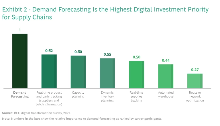 To improve supply chain performance, many companies have ramped up their investments in digital technology. A BCG survey found that companies plan to use this spending mainly to enhance traditional subfunctions. Demand forecasting is the highest priority, followed by tracking, planning, and automation. (See Exhibit 2.) We see little evidence that companies are considering AI use cases that enable autonomous decision making. In the absence of entirely new applications of AI, it is not surprising that the decades-old challenges of declining service levels, suboptimal inventories, and excessive manual effort persist.