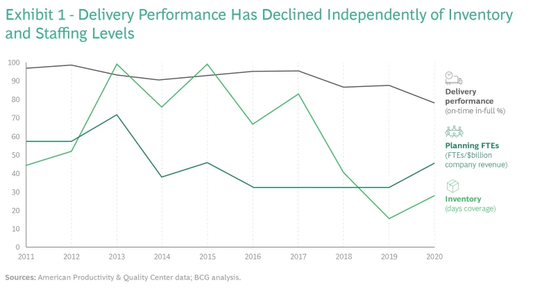 BCG’s analysis of supply chain KPIs from 2011 through 2020 reveals insufficient progress in addressing fundamental supply chain problems. (See Exhibit 1.) During that period, delivery performance declined independently of inventory and staffing levels. Even when companies boosted inventory and staffing levels at the onset of COVID-19, they still could not prevent a steep decline in service.