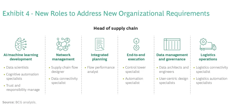 Introduce new roles. In a self-regulating supply chain, personnel transition from management to a variety of specialized roles, with new charters and profiles. (See Exhibit 4.) The emphasis shifts from fire fighting and routine decision making to building and orchestrating a supply chain ecosystem that includes technology providers and data integrators.
