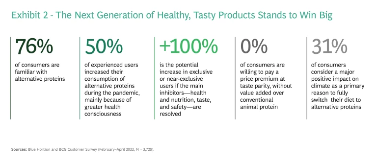 Alternative proteins have made substantial strides with consumers, who are broadly aware of this emerging food category and are favorably impressed when they try available products. (See Exhibit 2.) A 2022 survey by BCG and Blue Horizon, encompassing more than 3,700 respondents in seven countries, reveals that consumers in most markets appreciate the product attributes of taste, nutritional value, and health the most. We also found that improvements in three key areas—health, taste, and price—are key to boosting demand. Approximately 75% of respondents said that having a healthier diet is the primary motivator for them to start consuming alternative proteins. When it comes to making a purchasing decision between several products, though, taste emerges as a key criterion. Price remains a sticking point in all markets. Consumers are not prepared to pay a premium for a product that offers only taste parity with animal-based products.
