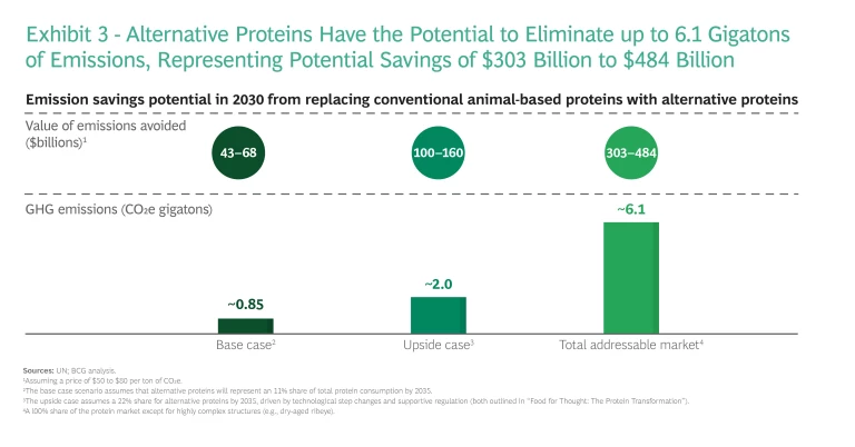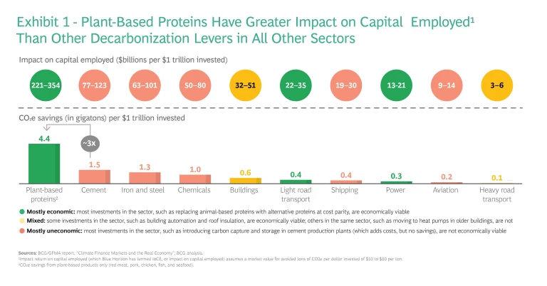 And this is exactly what alternatives proteins do. Investing in the segment has the highest CO2e savings per dollar of invested capital of any sector. The emission savings can be translated into a financial gain when assessed in terms of the market value of avoided CO2e emissions per dollar invested in mitigation efforts. To borrow a concept from finance, we call this impact return on capital employed, which Blue Horizon has coined as IoCE, or impact on capital employed. Given an estimated emissions value of $50 to $80 per ton of CO2e, a total addressable market (TAM) transformation would yield emission savings worth $303 billion to $484 billion. The resulting IoCE of $221 billion to $354 billion per trillion dollars of invested capital is at least three times greater than anything corresponding abatement investments in other high-emitting sectors of the economy, such as transportation or buildings, can achieve. (See Exhibit 1.)