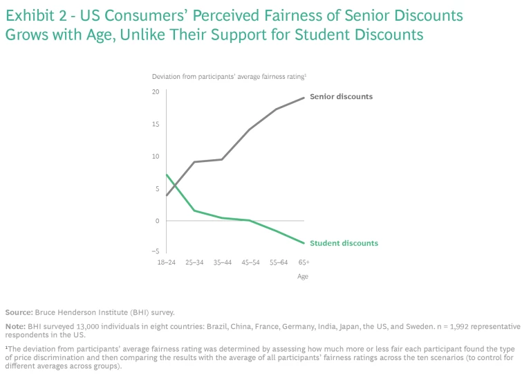 What do seniors think about their discounts? In the US, the older the seniors get, the fairer they feel their discounts are. (See Exhibit 2.) But they show much less enthusiasm for lower prices for students.