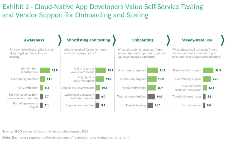 Different segments prefer—and look for—specific things when it comes to enterprise tech. For example, a recent BCG survey found that cloud-native application developers prioritize easy, self-service testing, as well as access to vendor resources when onboarding and scaling a new solution. (See Exhibit 2.)