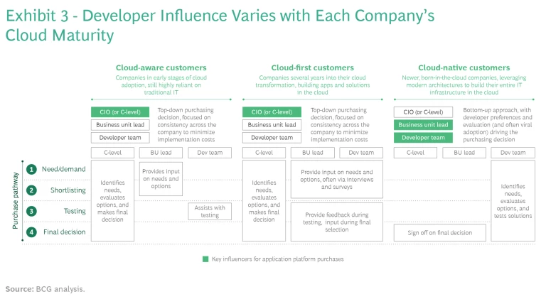 - Cloud-native application platforms. These platforms—which include Anthos, Amazon EKS, and VMware Tanzu—host a company’s application (think Uber running its mobile app) and provide tools for deploying and managing releases. An integral part of the development architecture, the platforms are of particular interest to DevOps engineers. Cloud-native app developers—the platform’s end users—are often influential, too, though how much so typically depends on their company’s cloud maturity. (See Exhibit 3.) Their influence can be indirect, as well. As creators (especially within the independent software vendor, or ISV, ecosystem), they develop the point solutions that help extend a platform’s functionality—and increase its appeal to potential customers.
