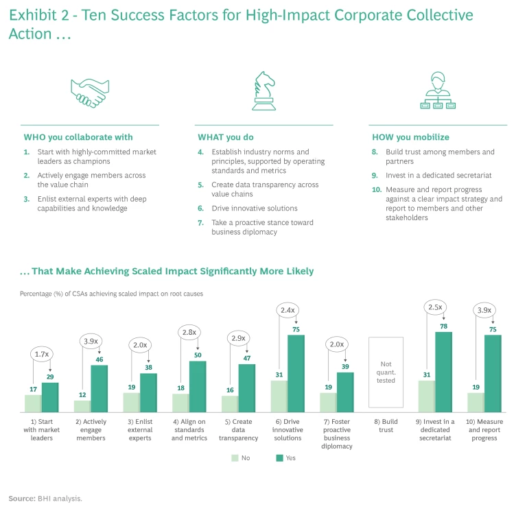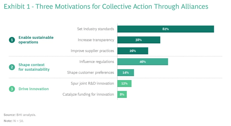 BCG Henderson Institute research found that high-impact corporate-led sustainability alliances are action-oriented, transparent with data, focused on innovative solutions, and willing to engage with regulators and government leaders to shape the sustainability agenda. Specifically: