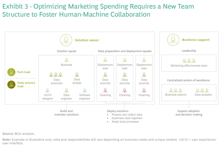 Organizations should build a centralized, cross-functional team composed of data scientists, machine learning engineers, user experience experts, and others to design and maintain their new solutions. (See Exhibit 3.) In some cases, organizations must hire new talent to fill these positions. They should establish centers of expertise that will be responsible for aligning processes and supporting broader adoption across markets. Finally, they will need to establish temporary deployment teams to roll out the solution in new markets.