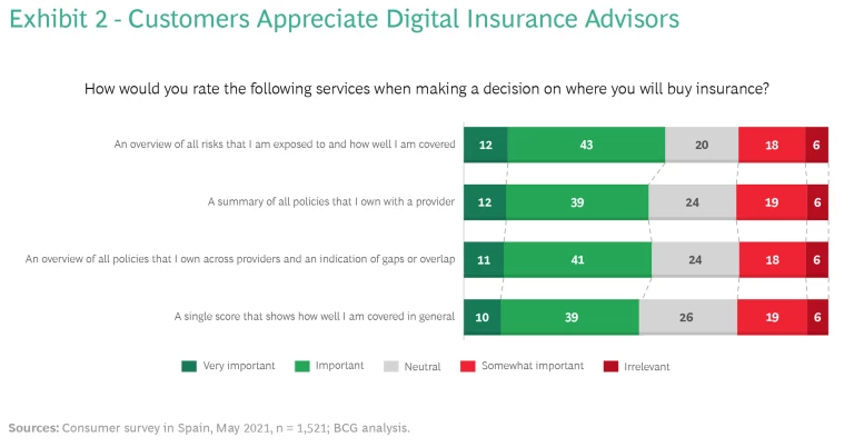 To assess customer views on personalization and innovation, we surveyed insurance consumers in Spain. The survey confirmed our observation from multiple markets that consumers are enthusiastic about features such as a single score that explains their overall coverage level or a tool that highlights gaps in coverage. (See Exhibit 2.)