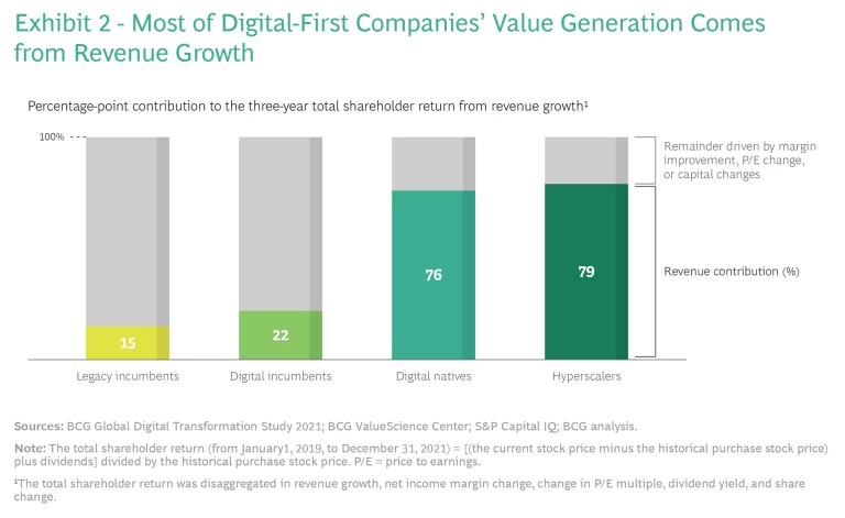 Much of the contribution to the high returns of digital companies comes from revenue growth. Leading digital incumbents generate significantly more value from growth than their legacy counterparts do, and they will emphasize growth even more as they pivot their agenda toward innovation both within and beyond the core. Revenue growth dominates value creation for digital natives, something that digital incumbents can aspire to as they build their innovation skills. Hyperscalers also continue to rack up impressive gains, especially given their size. (See Exhibit 2.)