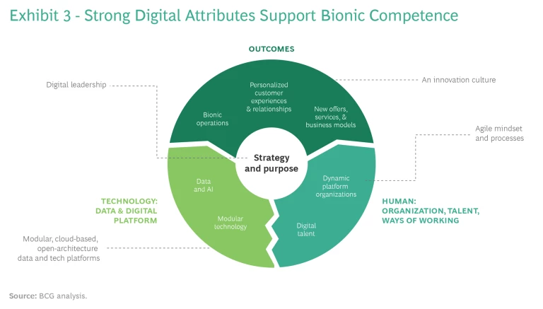 The race is on to see which companies emerge as successful bionic enterprises. Incumbents, in particular, need to assess whether they are still dominated by legacy attributes or whether they are successfully developing at-scale digital capabilities. The required attributes, scorecards, and playbooks are now clear. The challenge for executive teams is to implement their digital agendas faster and better than others.