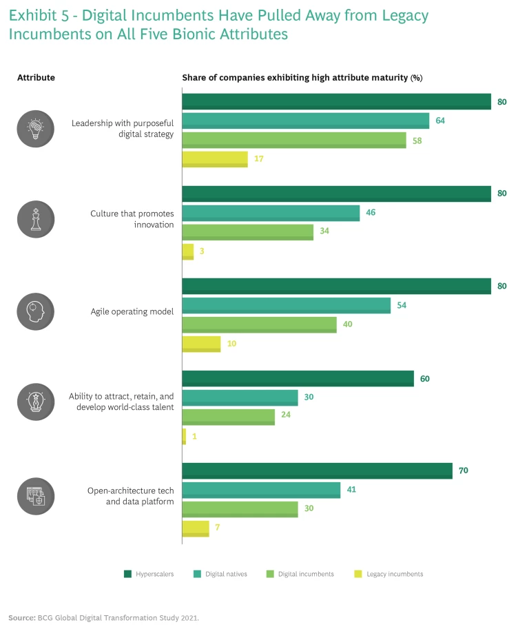 Half of hyperscalers exhibit strong adoption of all five attributes, with scores of 9 or 10 on each one. (These scores are all the more notable given the size and geographic spread of these companies.) But the really significant new dynamic is how digital incumbents are pulling away from their legacy competitors and catching up with digital natives. (See Exhibit 5.)