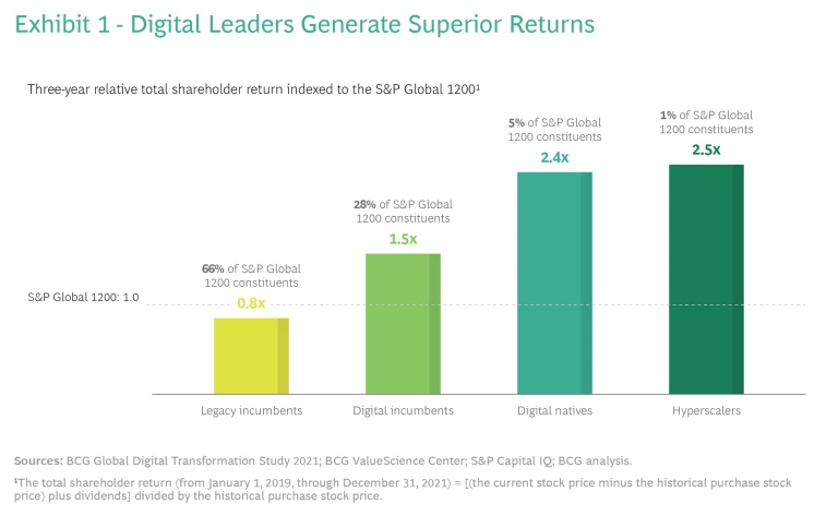 The successful companies of the future will follow the lead of hyperscalers and many digital natives by building digital capabilities—both human and technological—to become what we call bionic. Along the way, they will deliver superior innovation and performance. For the three years ending on December 31, 2021, hyperscalers generated returns that were 2.5 times higher than those of the S&P 1200 as they benefited from high growth and low unit costs in huge high-growth markets, such as cloud services, search, and data-driven advertising. (See Exhibit 1.) Digital natives overall performed at a similar level, benefiting from high growth and the high multiples that investors awarded to the future growth prospects of their disruptive business models. Leading digital incumbents outperformed the S&P 1200 by about 50% as they used their digital capabilities to improve customer experience and productivity and began to focus on innovative revenue growth. Legacy incumbents—which struggled to drive growth and improve productivity, relying predominantly on traditional levers—underperformed the index.