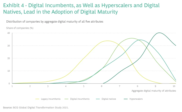 The research highlights the different digital dynamics in four types of companies: hyperscalers, digital natives, digital incumbents, and legacy incumbents.