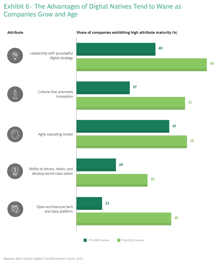 Some digital natives have allowed aspects of legacy behaviors to creep into their organizations. Those that were established before 2005 tend to have more legacy attributes, suggesting that as companies mature over time, there is some erosion in their digital attributes as it becomes hard to fight off legacy mindsets and technology debt. These companies will need to undertake their own digital transformations to regenerate their digital capabilities. (See Exhibit 6.)