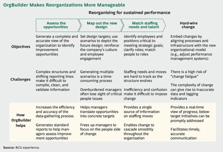 OrgBuilder addresses problems that seem endemic to reorganizations. Even the most well-coordinated transformations impose heavy burdens on a company’s senior and middle managers, who—apart from trying to guide a massive change program, stay focused on strategic goals, and keep the business humming—often end up devoting a disproportionate amount of time to gathering, validating, and managing the vast amounts of data needed to make informed decisions about the new structure. Given its functionality and tight fit within the change process, OrgBuilder has become an indispensable part of BCG’s broader approach to reorganizing for sustained performance.