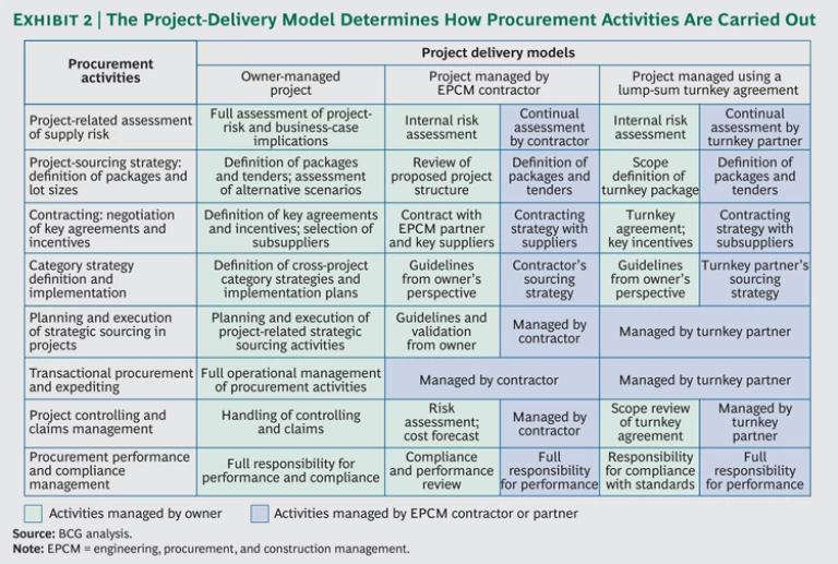 The appropriate delivery model depends on a range of factors and determines how the many critical activities involved in procurement are carried out. (See Exhibit 2.) A portfolio with numerous projects will likely include more than one approach.