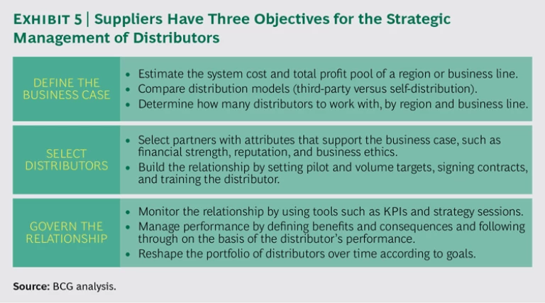 For suppliers, the objectives are to develop a clear business case for outsourced distribution, evaluate and select distributors accordingly, and manage them as true strategic partners. For distributors, the objectives are to build up institutional expertise in both technical capabilities and sales force effectiveness, make strategic acquisitions to increase their size and scale, and manage brands effectively.