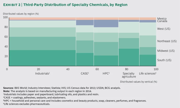 In addition, we adapted the definition of specialty chemicals to incorporate business practices in the North American market. For example, we included specialty agricultural chemicals and certain industrial chemicals in our analysis. This resulted in a larger market than any analyzed in our previous reports. Furthermore, also unlike in previous reports, we included Mexico in the North American market. Our extensive primary research thus indicates a higher incidence of third-party distribution in North America today than was observed or assumed in earlier analyses.