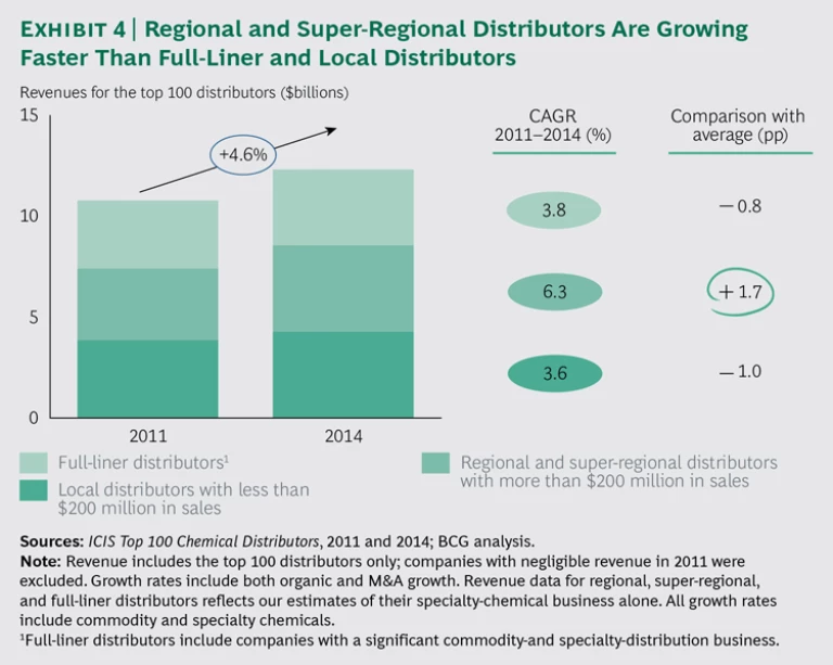 Of the three, regional players have been growing the fastest in the US. Super regionals have been growing particularly fast because they have been gaining market share as suppliers reduce the number of distributors they work with. Specifically, global full-liner companies posted a compound annual growth rate of 3.8% from 2011 through 2014, while local players grew at 3.6%. But regionals grew several percentage points faster during the same period—at 6.3%. (See Exhibit 4.)