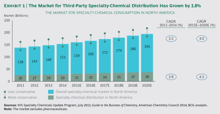 We expect that growth for the overall US chemical market will accelerate through 2020. Key factors in that acceleration will be the revitalization of manufacturing in the US, driven by cheap energy and attractive productivity-adjusted labor rates. (See North American Chemicals 2020: Capturing Opportunities in the Revitalized Industry, BCG report, July 2015.) We also expect that the specialty market will pick up in line with this increased momentum and grow at an annual rate of approximately 4% through 2020. The trend toward third-party distribution of specialty chemicals will continue—with projections for annual growth of 4.5%—leading to a larger gap between overall specialty growth and the share of volume that goes to customers through third-party distributors.