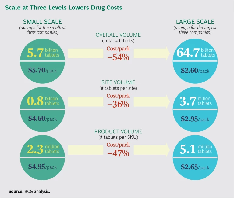 It quickly became obvious that the key factor in driving down production costs was scale. To dig deeper, we analyzed three types of scale: overall volume (the number of tablets produced within each business unit), site volume (the number of tablets produced at a given site), and product volume (the number of tablets per SKU). Simulations showed that a doubling of each type of scale does not affect production costs equally: