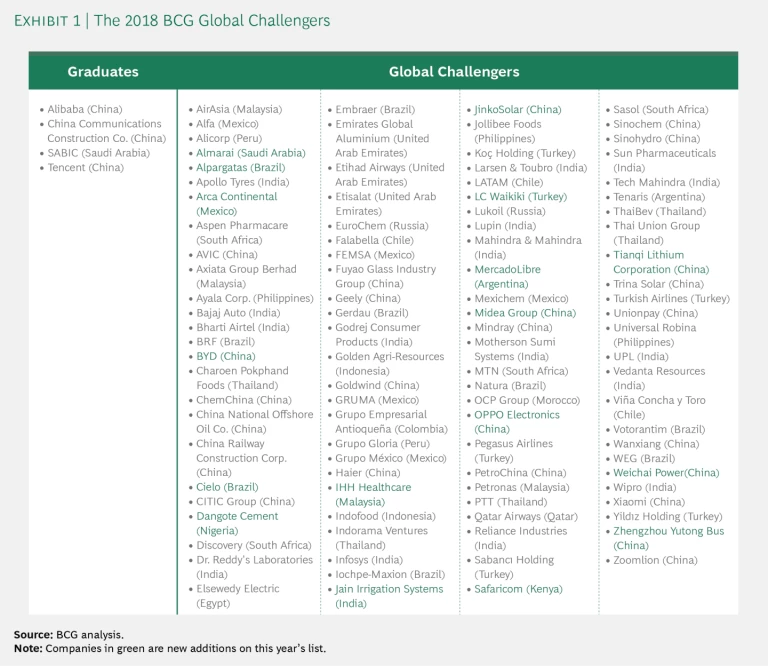 At first glance, the 2018 Global Challengers 100 list bears a lot of resemblance to previous years’ lists. (See Exhibit 1.) Four companies graduated to become global leaders, and 17 companies joined the list. It’s a diverse group, with all major regions and many economic sectors well represented.