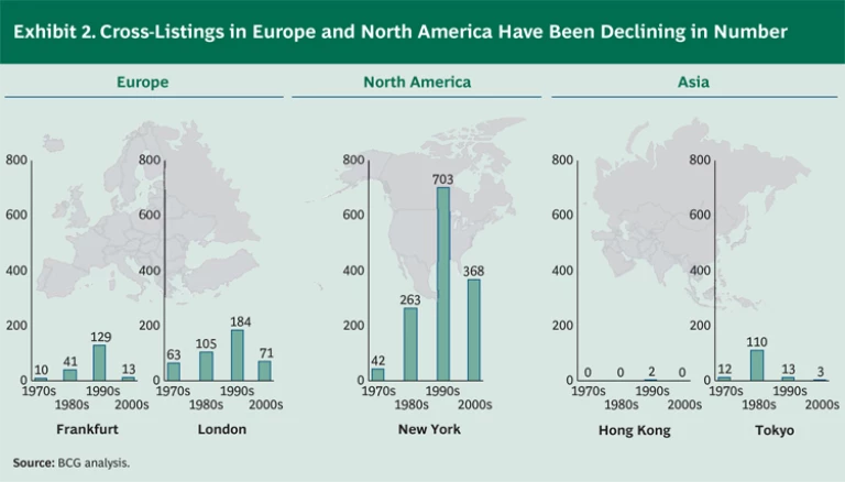 Cross-listings have been used to achieve similar objectives for decades. New York, London, and Frankfurt were popular choices for secondary listings in the 1990s, and there was a short-lived surge in Tokyo during Japan’s economic boom in the 1980s. However, many companies delisted in New York recently after finding that the costs and increasing regulation involved in secondary listings there did not produce the expected benefits. The number of secondary listings in Europe declined for similar reasons after the bursting of the dot-com bubble in 2000. (See Exhibit 2.)