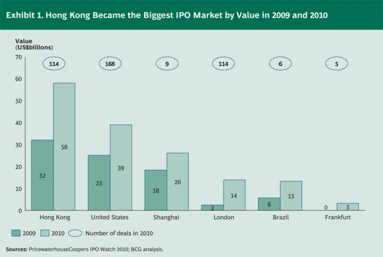 Hong Kong became the world’s largest IPO market by value in 2009 with public offerings that raised US$32 billion, and it held its lead in 2010 with offerings worth US$58 billion. (See Exhibit 1.)