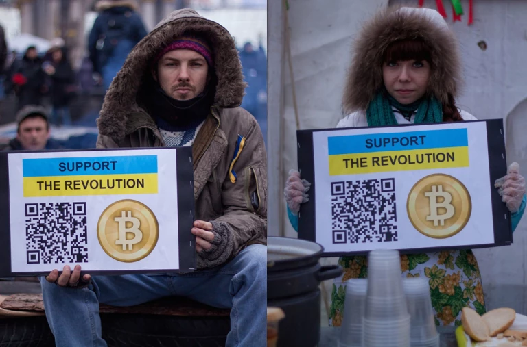 In the winter of 2014, Ukraine was on the brink of revolution. Protesters in Kiev held signs for the television cameras asking for money. (See image below.) The signs bore a QR code that allowed donors to send bitcoin to the protest movement. Thousands around the world pointed their cellphone cameras at the on-screen video and made donations with literally three clicks. The transactions were communicated in 20 seconds and confirmed within ten minutes at a cost of a fraction of a cent per dollar. They were anonymous: the government could not monitor them, and the recipients did not know whom to thank.