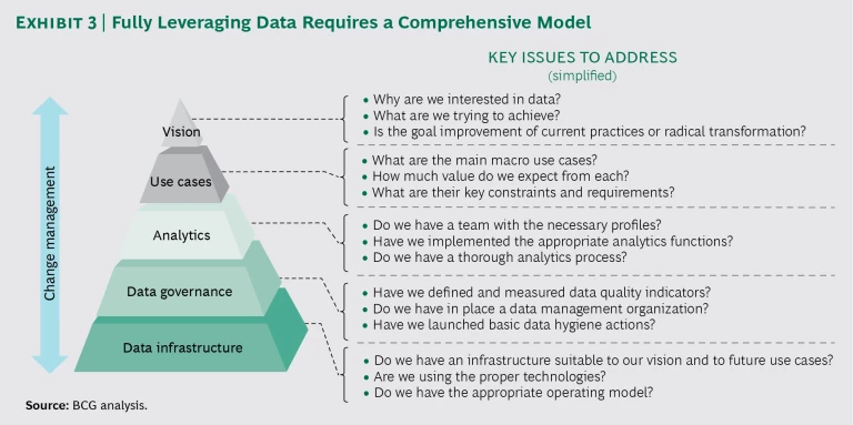 Build a vision. When planning a data-driven transformation, a company must set the appropriate vision for its business. For some companies, the transformation will mostly be about using data to improve operations and to compete more effectively. For others, it might involve building new business models. The visioning exercise should include identifying the macro use cases—the most important projects that the company wants to undertake.