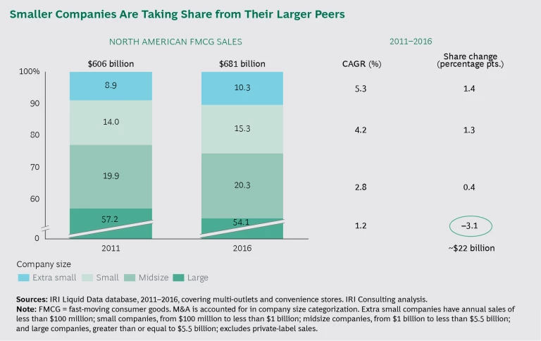 For the past five decades or more, multinational FMCG companies strengthened their brands, expanded their portfolios, steadily increased share and revenues, and created strong shareholder value. It was an era of big media, big retailers, and big brands. But about five years ago, smaller companies and brands began to take share from their much larger rivals for the first time. In North America, about $22 billion in industry sales shifted from large to smaller companies from 2011 to 2016. (See the exhibit.) Europe has experienced a similar shift. What’s behind this change?