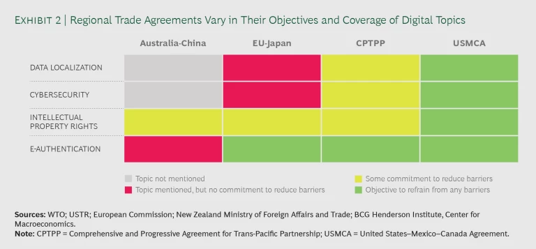 The legal context for digitally enabled trade consists of a mosaic of national and multilateral rules. At the multilateral level, progress has been slow. Recent bilateral and regional trade agreements (RTAs) have started to fill the void, but each RTA has its own objectives and rules. The United States–Mexico–Canada Agreement (USMCA) has the widest coverage of digital-related provisions and the strongest language concerning the removal of restrictions related to digitally enabled trade. Others have less comprehensive coverage and weaker rules. (See Exhibit 2.)