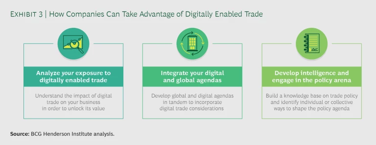 Integrate your digital and global agendas. Firms that have identified a current or emerging exposure to digitally enabled trade need to ensure that their digital and global agendas are aligned. This seems trivial but organizationally might be anything but.