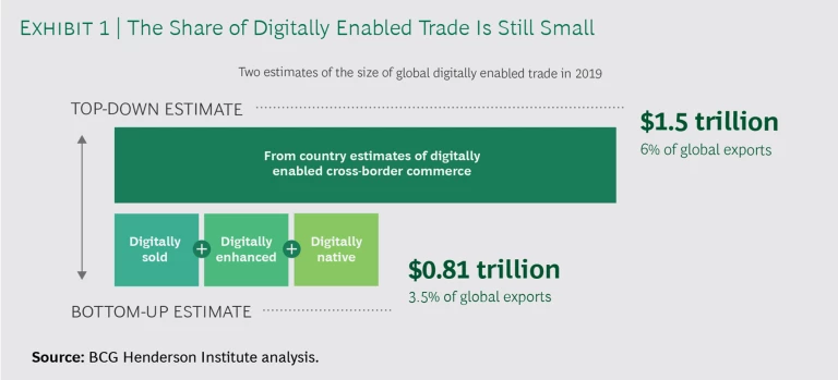 Using these conservative measurements, we estimate that in 2019 digitally enabled trade will be worth about $800 billion (the bottom-up estimate) to $1.5 trillion (the top-down estimate). (See Exhibit 1.) This is meaningful in overall size, but at a share of about 3.5% to 6% of global trade, it is far from dominant. For individual market segments and firms, however, the share might already be much higher. In fact, digitally enabled trade categories are growing faster than trade overall, and we estimate that up to 70% of all global trade flows could eventually be meaningfully affected by digitization, with 22% of trade, especially in service sectors, most susceptible.