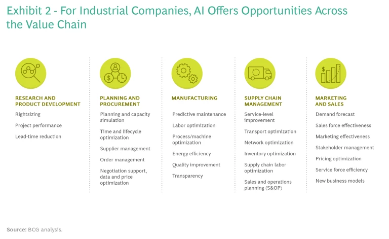 The challenges industrial companies face when implementing an artificial intelligence solution are real, but they are largely self-imposed. By approaching AI with the right mindset—and with the needed capabilities and talent—players can ensure benefits across the industrial goods value chain. (See Exhibit 2.)
