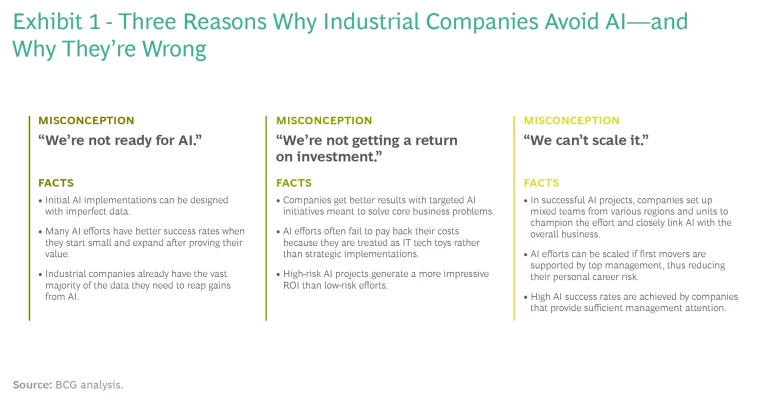 To unlock these benefits, players in the industrial sector must overcome their own resistance to AI. We believe that three common misconceptions are hampering companies’ chances for successful AI applications. (See Exhibit 1.)