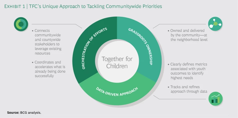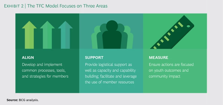 - Orchestration. After initially considering a typical nonprofit structure, BCG helped TFC move to a lean organizational setup that directs resources efficiently without adding significant overhead. At its core, TFC plays a role similar to a program management office, providing support and coordination across teams and neighborhoods, removing roadblocks, communicating key information across the organization, and helping stakeholders work together. Founding TFC members, an emerging advisory board made up of leaders from each of the six neighborhood coalitions, and an accountability director keep TFC independent, anchored in the community, and focused on agreed-upon goals. This structure will give TFC the ongoing ability to coordinate, support, and measure efforts—without eating up valuable resources. (See Exhibit 2.) Balancing these different elements is hard, but it’s a critical part of TFC’s success. It took years of work—including defining the vision, outlining specific initiatives for tackling youth safety and well-being, and establishing a structure for coordinating effects—to get the groundwork in place and ensure that the coalition could have a long-term impact.