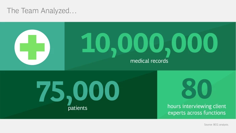 BCG assembled a cross-functional team of data scientists, analysts, physicians, and commercial biopharma experts who worked side-by-side with the client, on site, to focus on its largest market. The joint team sifted through more than 10 million medical records for 75,000 patients, along with payer claims data and information from other sources. To ensure that the data was being interpreted correctly, the team spent more than 80 hours interviewing oncologists and client experts across functions.