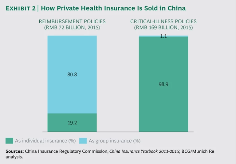 Most people with reimbursement insurance in China have obtained it through group policies at the companies where they work. (See Exhibit 2.) Multinational corporations that do business in China often offer their executives high-end reimbursement policies that cover visits to private hospitals. The reimbursement insurance available to middle managers at these companies tends to be more limited—for instance, covering surgical procedures only at public hospitals. There are also differences according to employers’ financial strength, with the most profitable MNCs typically offering the most generous reimbursement benefits.