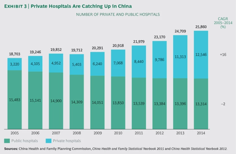 Second, the government has introduced incentives for more private hospitals to form and operate. As of 2005, there were only about 3,200 private hospitals in China. By 2014, that number had almost quadrupled, to more than 12,500. (See Exhibit 3.) A growing ecosystem of private hospitals is critical to the development of reimbursement insurance because private hospitals can share data with insurers and be partners in the push toward a healthier population.