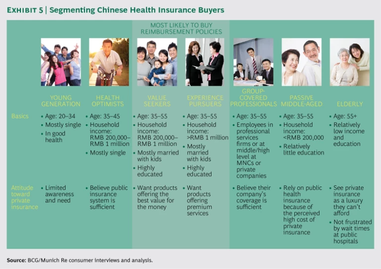 In a survey of almost 1,000 Chinese consumers, BCG and Munich Re identified seven groups of individual health insurance consumers in China, two of which have especially high potential as purchasers of reimbursement insurance. We call the first high-potential group “experience pursuers.” (See Exhibit 5.) These are people aged 35 to 55 with household incomes above RMB 1 million ($152,000). By our calculation, there will be more than 4 million such people in China by 2020. Highly educated and typically married with children—and