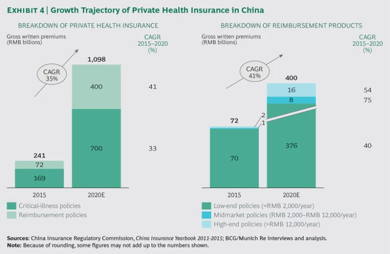 Together, these developments position reimbursement policies purchased by individuals to become a substantially bigger part of the health insurance market in China. Such policies have grown faster than the market for critical-illness policies in recent years. Our expectation is that this trend will continue and that reimbursement products at every level—low end, midmarket, and high end—will enter a sustained period of more rapid adoption.