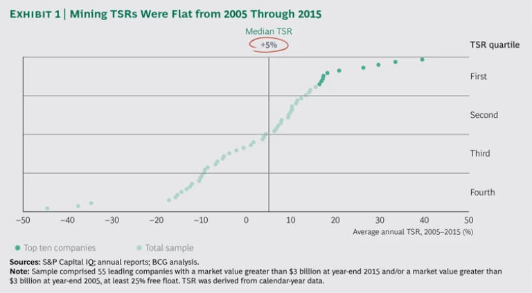 The Boston Consulting Group analyzed the performance of 55 leading mining companies from around the globe from 2005 through 2015. We found that these companies delivered a median annual TSR of just 5% during that period, lagging behind the S&P 500’s 7.3%. (See Exhibit 1.)