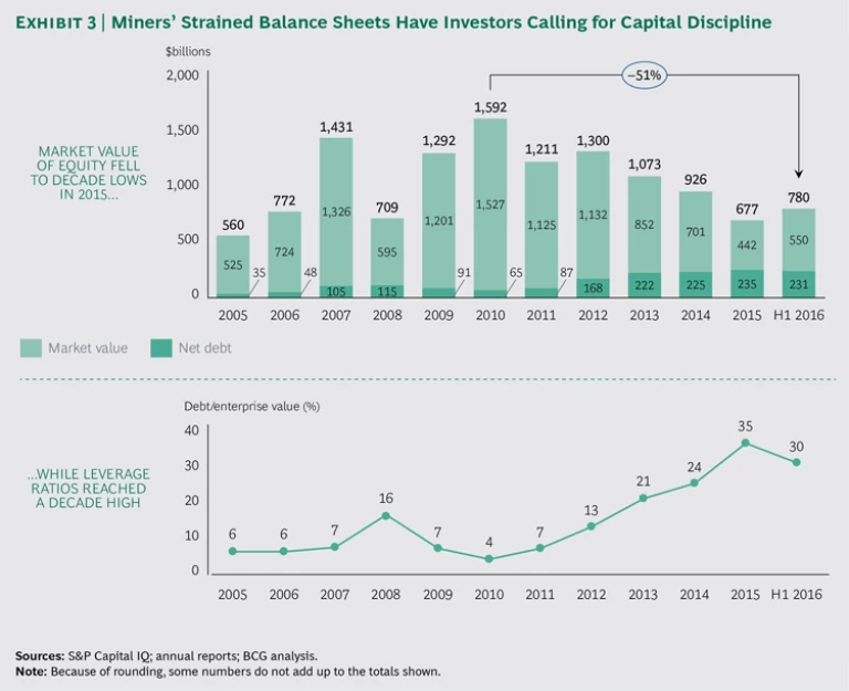 - Do we use our balance sheet wisely? Miners must actively manage the tradeoff between reinvesting cash to drive profitable growth and distributing it to shareholders. Companies will have different value creation priorities, and the way they manage this tradeoff—investing heavily to drive advantaged growth in the core business versus creating value through restructuring or asset liquidation, for example—has implications for their capital requirements. But one thing is certain: failure to manage the tradeoff effectively attracts activist attention.