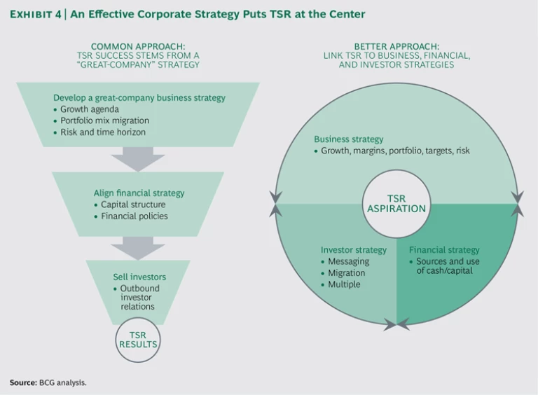 Meeting the Great-Company/Great-Stock Imperative. Many companies focus too much on being a great company, viewing TSR as simply the end result of their strategic efforts. They craft a great-company business strategy, including a growth agenda, a portfolio strategy, and risk management efforts. They then align their financial strategy, including the capital structure and requirements and financial policies, with the business strategy. Finally, they pitch the plan to investors with the expectation that successful TSR results will follow.
