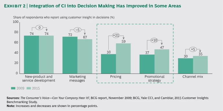 That’s not to say that progress hasn’t been made: in the years between our two studies, more-advanced CI functions have mastered a broad set of activities and skills, including building influence within the company, effectively managing a range of stakeholders, and enhancing client interaction. In addition, CI and commercial analytics team members have been forced to become more proactive and creative in disseminating relevant and timely customer insights. And our research shows that the influence of CI leaders and practitioners is increasing: the percentage of companies that pull CI into decision making increased to 68%, from 54% in 2009. The biggest gains for CI involvement from 2009 to 2015 were in the areas of pricing and promotional strategy. (See Exhibit 2.)