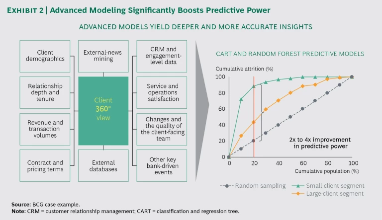 To get a 360-degree view of a customer, banks need to gather a deep, well-rounded data set. We recommend three to five years of data, including client revenues, volume, service, and customer relationship management information from across the bank. An analytics team of data scientists and business analysts should test different predictive algorithms, working first with a control group to get a more detailed baseline on how clients respond to known attrition triggers. Building on those results, the analysts can see other patterns and triggers that are revealed when advanced predictive techniques are applied. For example, classification and regression tree analysis, random forest modeling, and neural networks can be used to tease out subtle signals and patterns. The team can use these insights to design and refine predictive risk-scoring models. The attrition model can leverage client information, as well as product, transactional, and service data and generate risk scores that identify which clients are most likely to defect. (See Exhibit 2.)